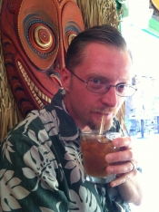 This is prior to the mustache and stinger look, but is relatively representative, particularly because it includes the mandatory icy cold adult beverage: