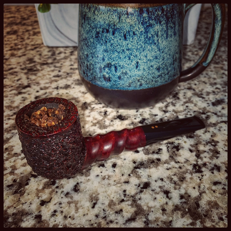 Did a set of walking reps on this beautiful sunny day, and am not far from finishing this bowl of year 2016 D&R Three Sails in an undated straight brush etched black Molina apple with a nickel band and a black tapered vulcanite stem. Ice water and bergs is my drink.